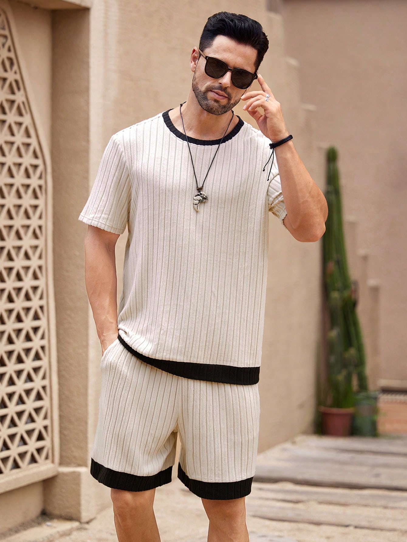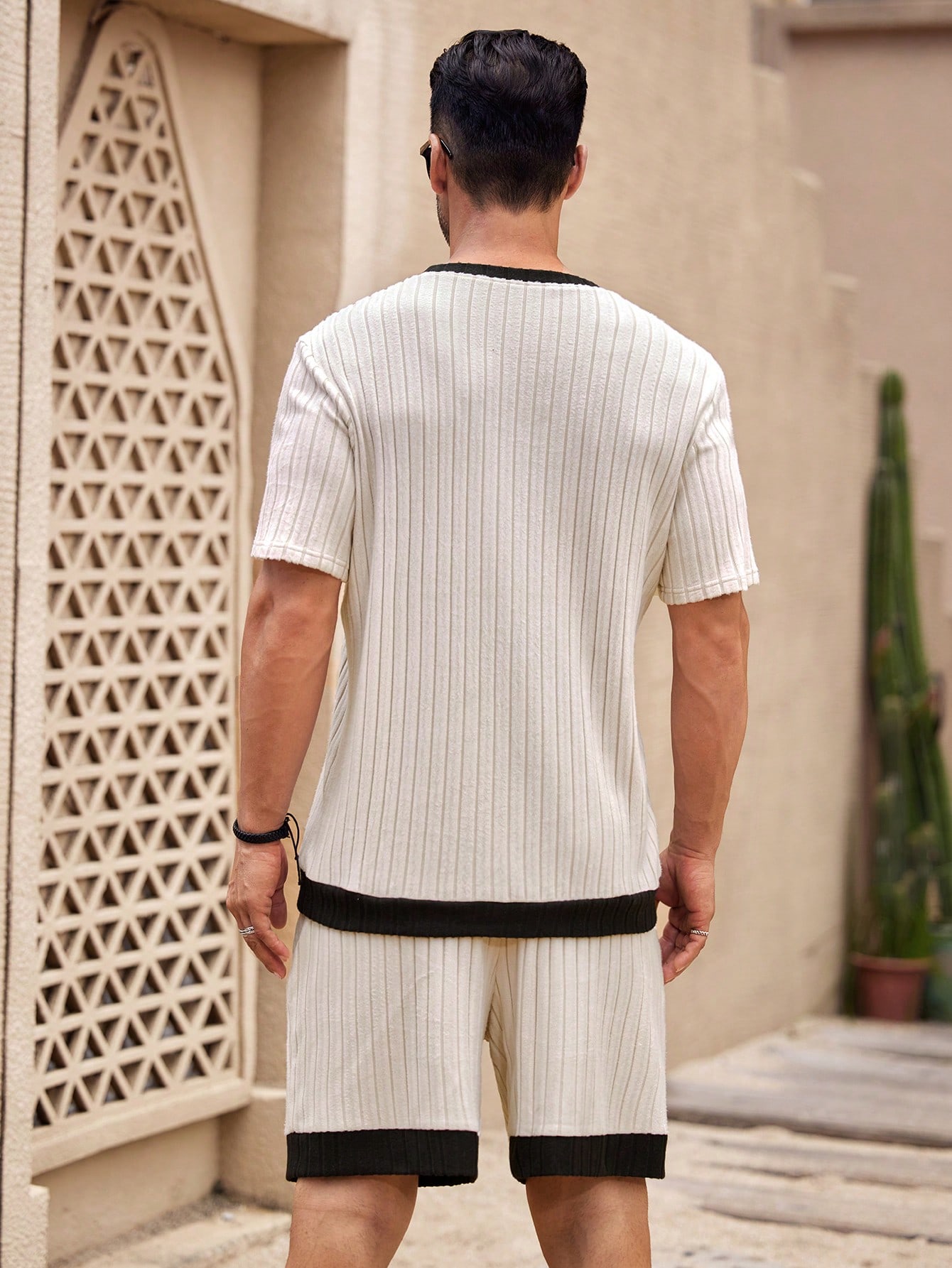 Be the first to review “Manfinity KASUA 2pcs Men??s Casual Colorblock Round Neck Short Sleeve Ribbed T-Shirt And Flap Pocket Shorts Set, Summer”