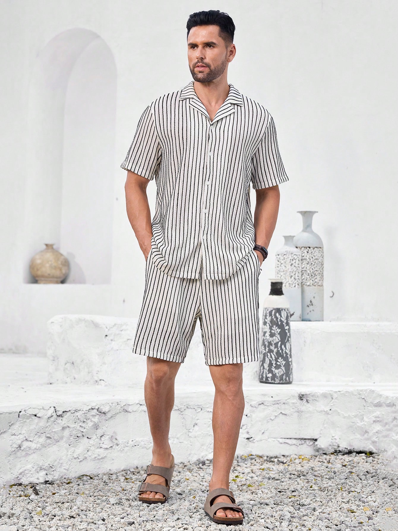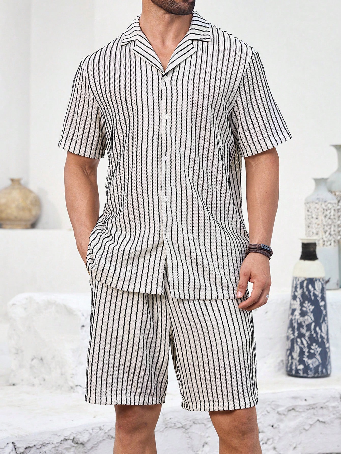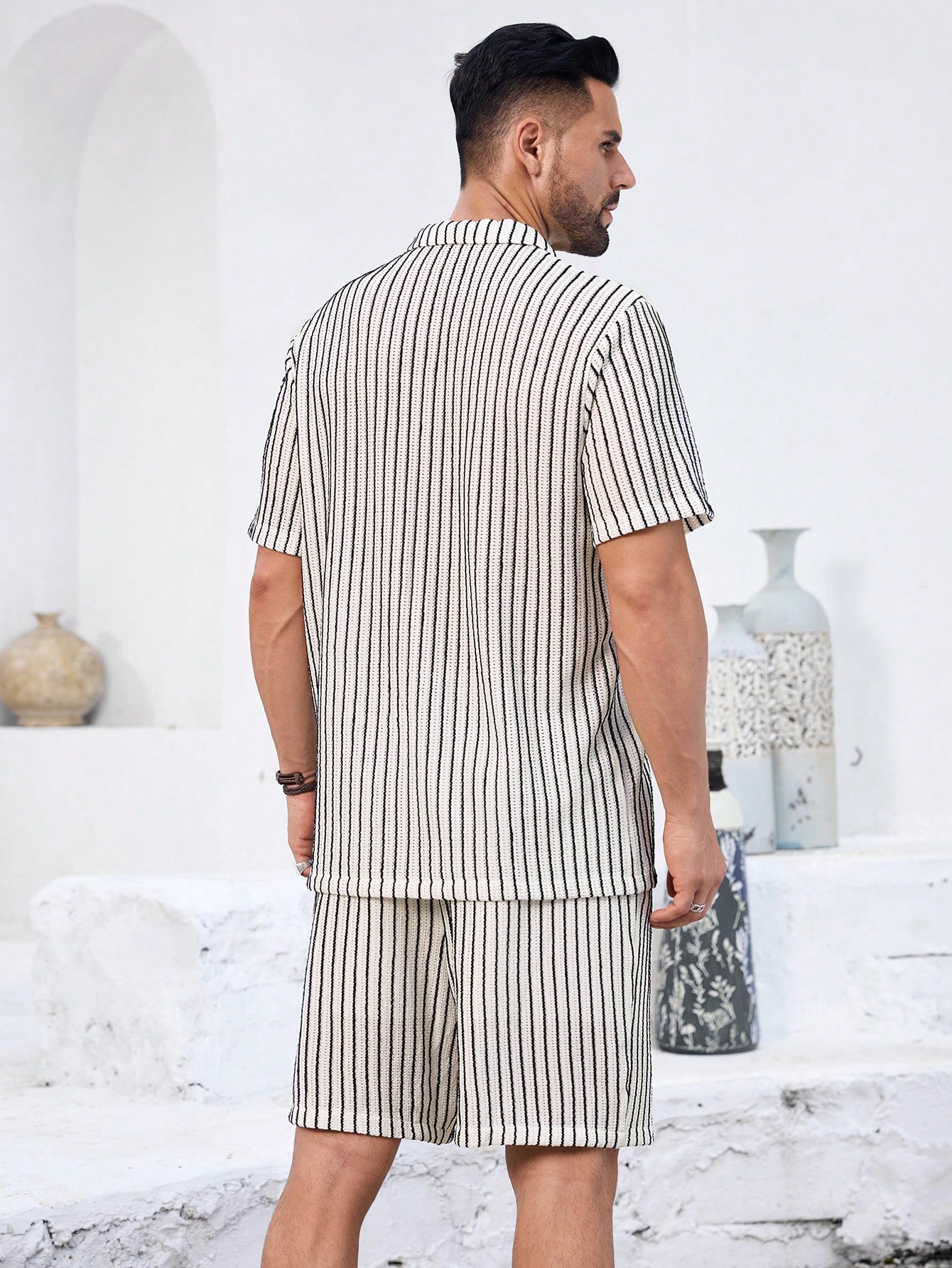 Manfinity KASUA Men Striped HollowCollar Shirt And Shorts Casual Suit