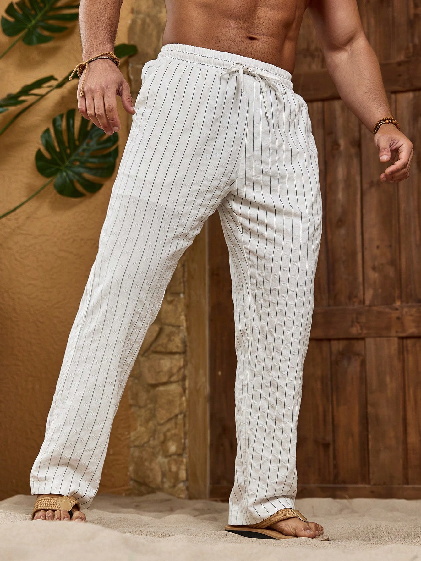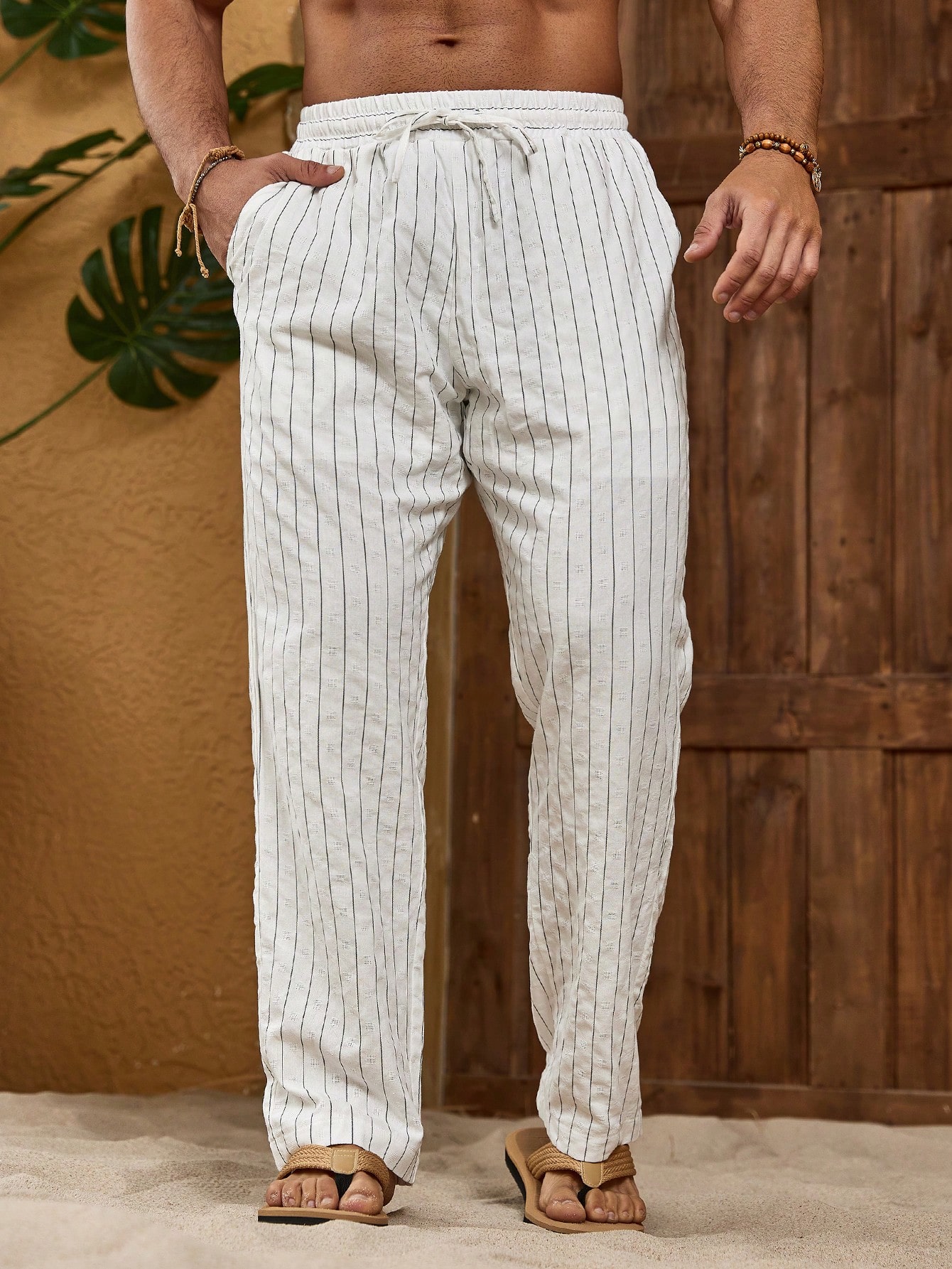 Manfinity KASUA Men??s Striped High Waisted Drawstring Pants With Pockets Baggy Long Slacks Cool Stripe Plain All White Going Out Husband
